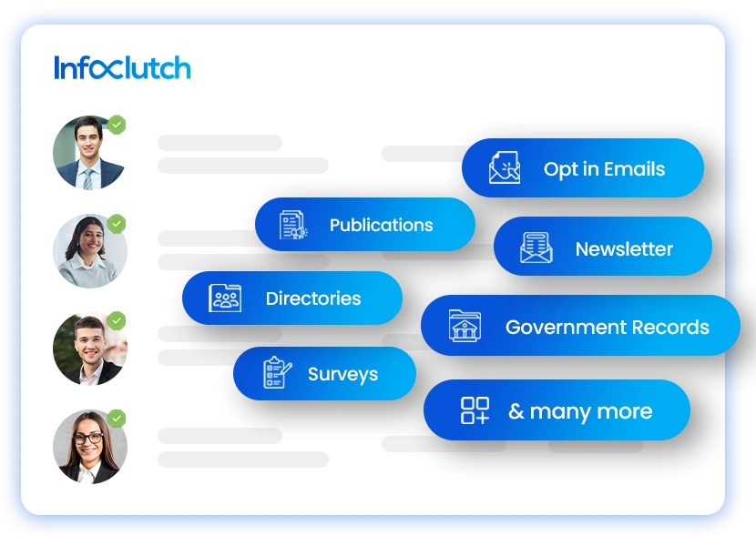 At InfoClutch, we source data from only the most premium, valid and legal data channels in the market. Some of our primary sources include B2B directories, Newsletters, government records, public records, LinkedIn data, surveys, opt-in emails and more.
